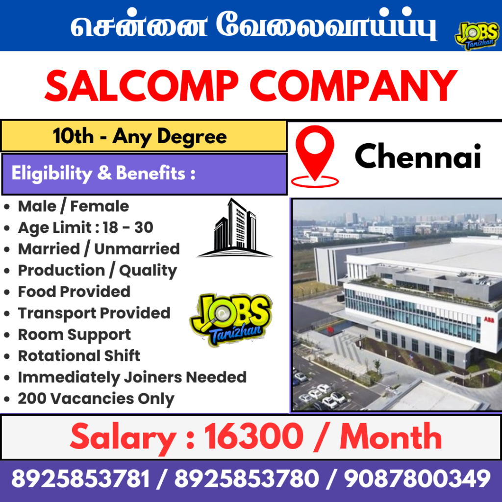 Salcomp Company Direct Recruitment 2026 | Chennai Jobs today Openings 2026 | Jobs in Chennai | Jobs in Tamil 2026| Tamilnadu Jobs Today Openings 2026 | Salcomp Jobs Recruitment | Jobs in Chennai 2026 Salcomp நிறுவனத்தில் தற்பொழுது அதிக அளவிலான வேலைவாய்ப்புகள் உருவாகியுள்ளன. இந்த நிறுவனமானது ஆட்கள் தேவை அதிகமாக இருப்பதால் தற்பொழுது நேரடி நேர்முக தேர்வு தொடர்ந்து நடத்தி வருகிறது. எனவே