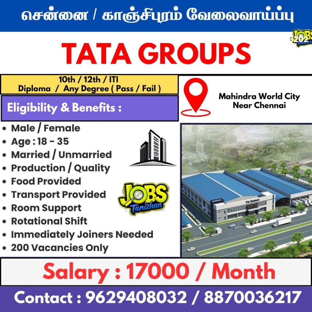 Tata Groups of Companies Recruitment 2026 – Chennai Jobs | Chengalpattu Jobs | Kanchipuram Jobs | Chennai Jobs today | Kanchipuram Jobs Today | Jobs in Chengalpattu | Chengalpattu Jobs Today | Jobs in Tamilnadu | Tamilnadu Jobs Today Tata Groups Job Details : இந்த நிறுவனத்தில் தற்போது அதிக அளவில்  ஆட்கள் தேவை இருப்பதால் நிறுவனம் தொடர்ந்து நேர்முகத்