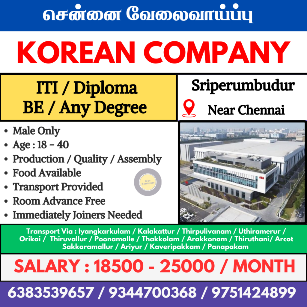 Korean Manufacturing Company Needs a Lots of Manpower at 2026 | Chennai Jobs today| Jobs in Chennai | Chennai Jobs today Openings 2026 | Jobs in Tamilnadu | Chennai jobs today openings 2026 | Jobs in Sriperumbudur| Sriperumbudur Jobs