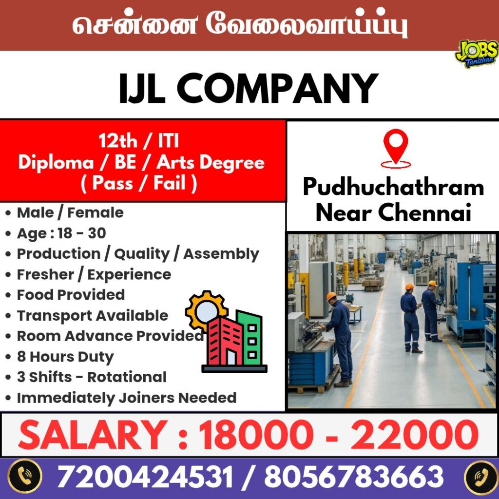 India Japan Lightings Private Limited Recruitment 2026 | Poonamallee Jobs | Chennai Jobs Today Openings 2026 | Jobs in Poonamallee | Jobs in Pudhuchathram | Jobs in Kanchipuram | Jobs in Chennai IJL company : Naps Trainee நிறுவனமானது சென்னைக்கு மிக அருகில் உள்ள புது சத்திரம் என்னும் இடத்தில் அமைந்துள்ளது. புதுச்சத்திரம் சுற்றியுள்ள நபர்களாக இருந்தாலும் அல்லது வெளியூரிலிருந்து தங்கி வேலை […]