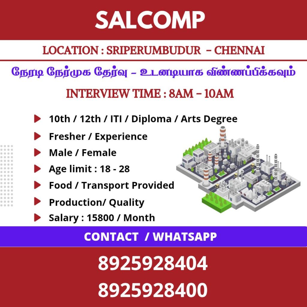 Top 3 MNC Companies In Chennai 2026 | Jobs in Chennai | Tamilnadu Jobs Today Openings 2026 சென்னைக்கு மிக அருகில் உள்ள இந்த நிறுவனங்களில் தற்பொழுது அதிகளவிலான வேலை வாய்ப்புகள் உருவாகியுள்ளன இந்த மூன்று நிறுவனங்களும் சென்னை சுற்றியுள்ள சிப்காடுகளில் அமைந்துள்ளன. சரியான கல்வித் தகுதி மற்றும் வயது வரம்பு உடையவர்கள் விண்ணப்பித்த பயனடையுமாறும் கேட்டுக்கொள்கிறோம். நிறுவனத்தில் உங்களுக்கான கல்வித் தகுதியாக பத்தாம் வகுப்பு 12ஆம் வகுப்பு ஐடிஐ முடித்தவர்கள் […]